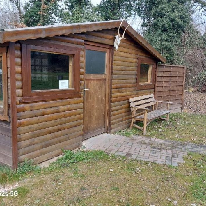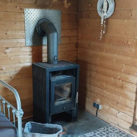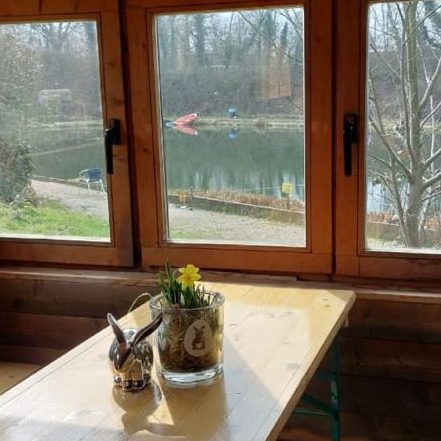 Unsere kleine gemütliche Stube im klassischen Holzgewandt, ein Ofen welcher für die Wärme in kalten Zeiten angefeuert werden kann und dem direkten Ausblick auf unsere Teiche...